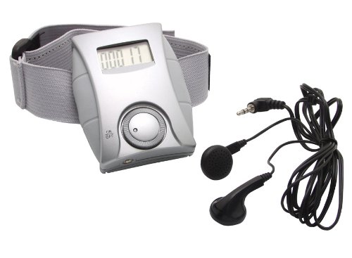 Podomètre électronique 6 fonctions : compteur de pas, conversion en distance parcourue (miles et km) et en calories dépensées, montre, timer, radio FM, étalonnage (longueur de pas et poids de l\'individu). Bootier en plastique gris argent et bouton en caoutchouc gris acier. Avec clip de ceinture et sangle élastique de bras. Livré avec piles et écouteurs.